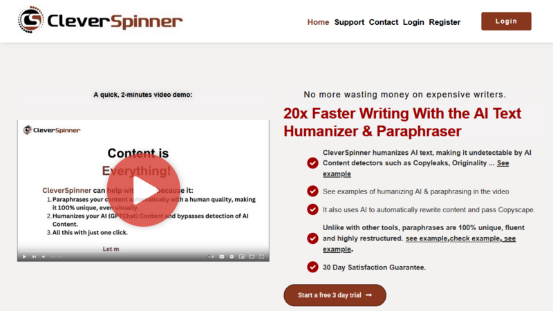What sets CleverSpinner apart is the way it can smoothly switch between active and passive voice. This little trick can easily confused any system trying to spot machine-generated text. Plus, you'll get three days of free trial, enough time to check if it suits your needs before deciding to use all of its features.